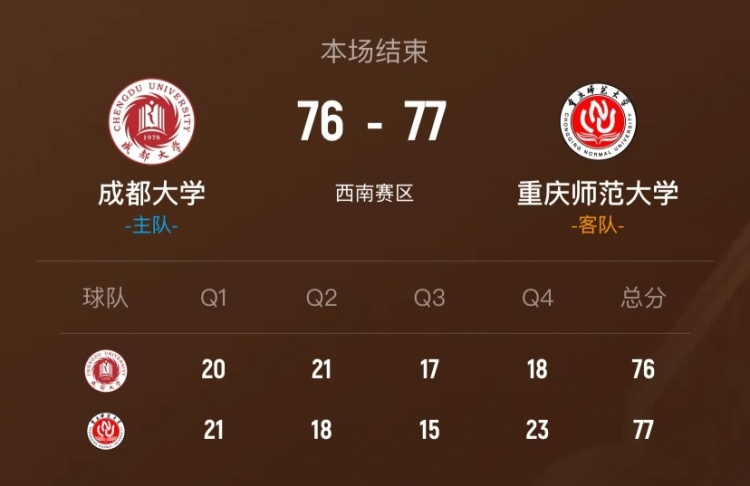 末节决战,重庆师大上来追平比分,王馨锐中投止血回应,罗子昂三分开和后王智墨还能回应answer ball,双方比分持续胶着多次打平。姜仁哲三分终于帮助重庆师大反超,柯盛益马上给出回应,欧阳占强三分再进后柯盛益还能给出回应,比赛进入白热化,罗子昂关键反击上篮助重庆师大领先到3分,柯盛益再次出手三分命中但踩线,最终重庆师大77-76险胜成都大学。